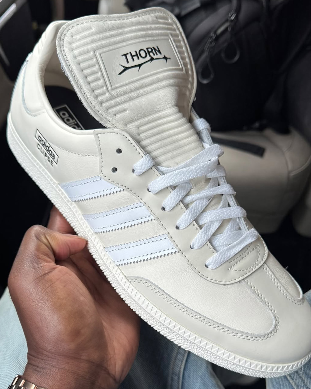 The design showcases an off-white leather upper, accented by soft grey overlays for subtle contrast. adidas’ signature Three Stripes appear in crisp white, while co-branded Clipse and adidas insignias are stamped near the ankle.